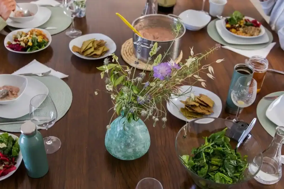 Unsere Küche basiert auf frischen, saisonalen Zutaten von lokalen Produzenten. Du genießt täglich zwei Hauptmahlzeiten sowie Snacks — überwiegend vegetarisch und vegan, mit glutenfreien Optionen. Den ganzen Tag über stehen dir außerdem Kaffee, Tee, Obst und Snacks zur Verfügung.